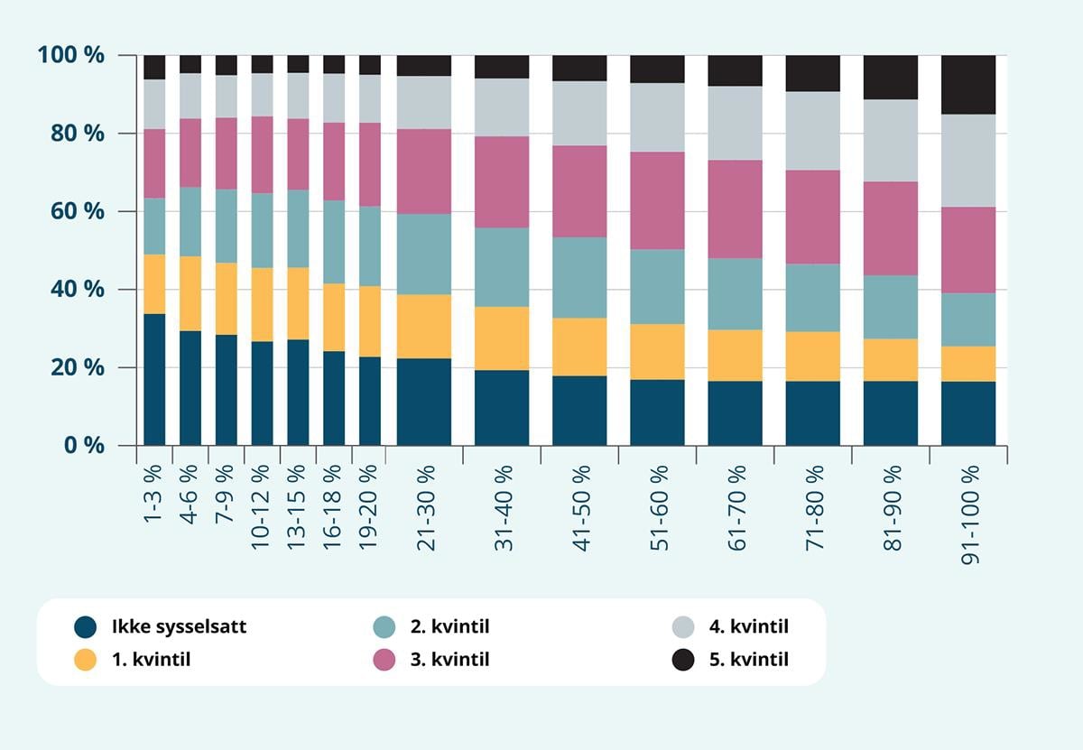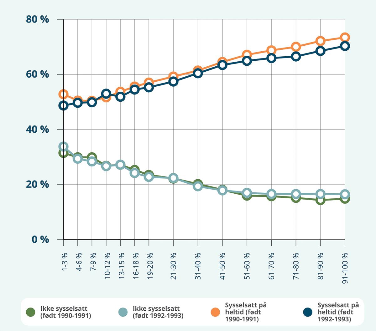 Note: Andel ikke sysselsatt og andel som jobbet heltid i 2021, etter husholdningens inntekt i 2006. (født i 1990-1991 og 1992-1993). Hel-/deltid basert på data fra a-ordningen i november 2021, og omfatter her bare sysselsatte lønnstakere. Heltid defineres som stillingsprosent lik 100 eller mer. Deltid er definert som stillingsprosent mindre enn 100. Se også https://www.ssb.no/arbeid-og-lonn/sysselsetting/statistikk/sysselsetting-registerbasert. Desil- og persentilinndelinger basert på inntekt per forbruksenhet for privathusholdninger i 2006. Inntekt justert for antall forbruksenheter i husholdninger (EU-skala). Lavinntekt definert som husholdninger med inntekt under 60 prosent av median (per forbruksenhet). Studenthusholdninger og aleneboende barn under 18 år er inkludert.