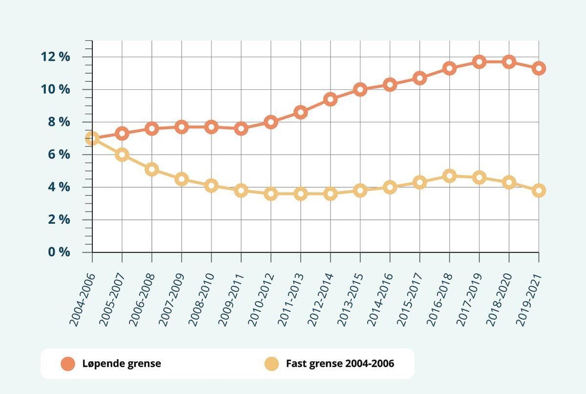 Note: Andel barn i husholdninger med vedvarende lavinntekt basert på fast og løpende lavinntektsgrense (løpende lavinntektsgrense er identisk med figur 3.1). År 2004-2021. Husholdninger definert som lavinntekt dersom de har gjennomsnittlig inntekt etter skatt i en treårsperiode under 60 prosent av median i samme periode. Inntekt justert for antall forbruksenheter i husholdninger (EU-skala). Fast grense er 60 prosent av median i perioden 2004-2006, justert for prisstigningen i påfølgende år. Studenthusholdninger og aleneboende barn under 18 år er ikke inkludert.
