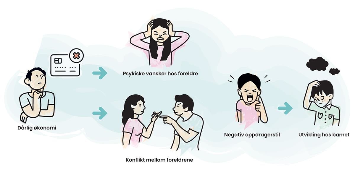 Familiestresshypotesen har sin opprinnelse i Elder (1974) sin dokumentasjon av konsekvensene av økonomiske tap og arbeidsløshet under den store depresjonen i USA på 1930-tallet. Teorien beskriver hvordan både akutt og kronisk økonomisk stress setter foreldre og barna i risiko for psykiske og relasjonelle problemer (Masarik & Conger, 2017). Foreldrenes uro over jobb, boforhold og den økonomiske situasjonen generelt, kan påvirke deres psykiske helse og konfliktnivået i hjemmet. Foreldre som er stresset kan ha mindre fokus og energi til å følge barna godt opp, tilbringe kvalitetstid med dem og ta i bruk en velfungerende og hensiktsmessig oppdragerstil. Uforutsigbarhet, inkonsistens og mangel på rutiner antas å kunne forstyrre barnets følelse av mestring og lede til hjelpeløshet, lavere selvregulering og håndtering av egen adferd og følelser (Evans, 2004). Dette kan illustreres med følgende figur: