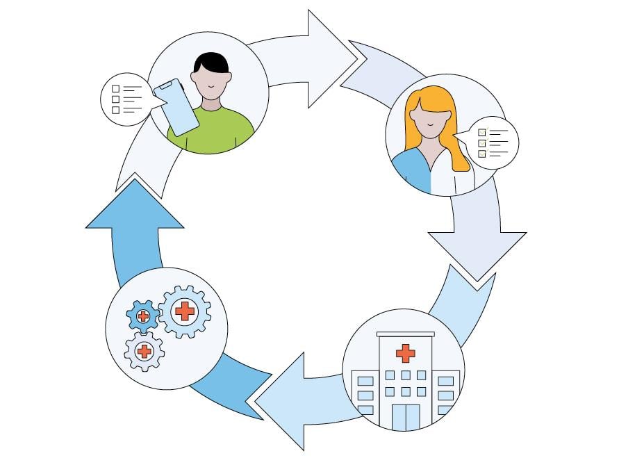 Figur 7.1 Illustrasjon av hvordan pasienters digitale tilbakemelding på opplevd nytte av behandlingen (ePROM, øverst til venstre) gir viktig informasjon til behandleren i det aktuelle pasientforløpet (øverst til høyre) og nyttig oversikt over pasientbehandlingen i helseforetaket (nederst til høyre) som grunnlag for kvalitets- og forbedringsarbeid (nederst til venstre).