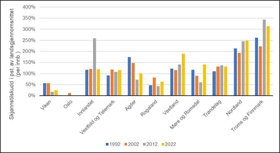 Det ble gjort noen justeringer i fordelingen da inntektssystemet ble lagt om i 2020, men hovedtendensen i 2022 er i stor grad den samme som i 1992: Oslo og fylkeskommunene rundt hovedstaden mottar lite eller ingen skjønnstilskudd, mens særlig fylkeskommunene i Nord-Norge mottar langt mer skjønnstilskudd målt i kroner per innbygger enn landsgjennomsnittet (jf. figur 19, som viser skjønnstilskudd per innbygger i prosent av landsgjennomsnittet for utvalgte år, summert til dagens fylkesinndeling).