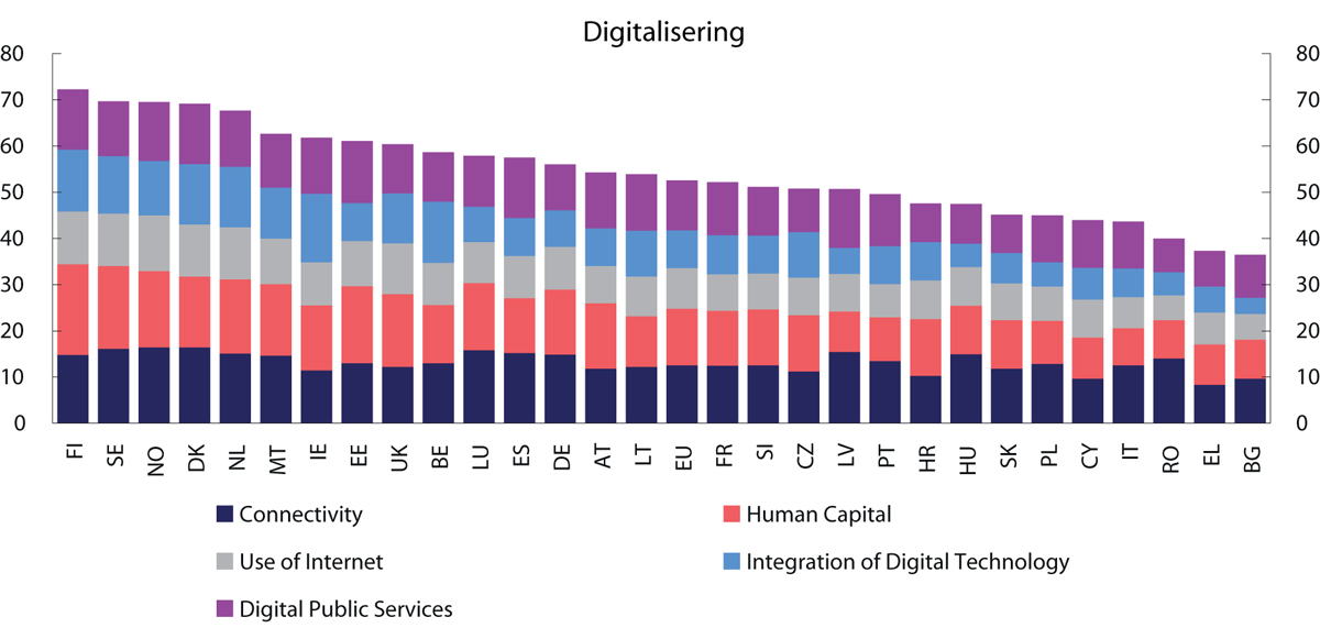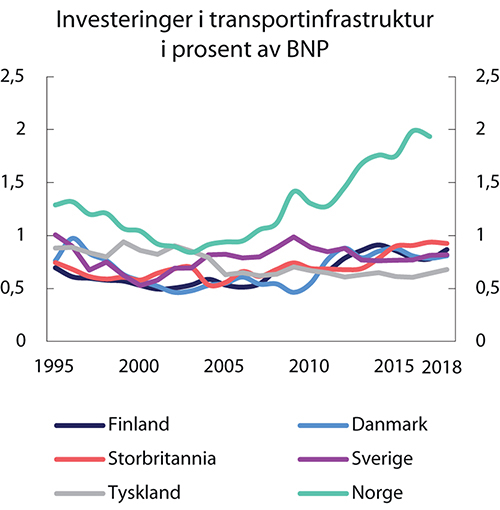 Siden den globale finanskrisen har produktiviteten i Norge og andre tradisjonelle industriland økt i lavere tempo enn før, se figur 5.1. I Fastlands-Norge falt veksten i arbeidsproduktiviteten, som viser forholdet mellom bruttoprodukt og timeverk, fra rundt 2,6 pst. i perioden 1998–2007 til 0,7 pst. i perioden 2008–2019. Tilbakeslaget i fastlandsøkonomien etter utbruddet av covid-19 har gått sammen med lavere produktivitet i fastlandsøkonomien, da verdiskapingen har falt mer enn timeverkene. Utbruddet bidrar dessuten til usikkerhet om utviklingen fremover. Verdensbanken har sett på erfaringer fra de landene som ble hardest rammet av virussykdommene SARS, MERS, ebola og zika, og fant varige, negative effekter på investeringer og arbeidsproduktivitet. Også erfaringen fra andre økonomiske kriser er at de kan ha langvarige, negative virkninger på arbeidsproduktiviteten. Både i Norge og i andre OECD-land ventes investeringene i næringsvirksomhet å gå kraftig ned i 2020. Dersom realinvesteringene forblir på et lavt nivå over lang tid, slik mange europeiske land har opplevd etter finanskrisen, kan farten i den organisatoriske og teknologiske utviklingen gå ned.
