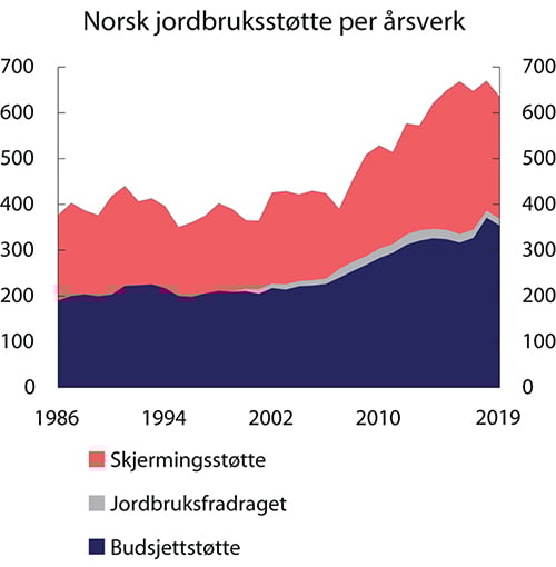 Figur 5.7 viser at skjermingsstøtten utgjør en betydelig del av støtten til jordbruket. Det totale støttenivået var relativt stabilt frem til 2007, men deretter økte støttenivået frem til 2016. Fallet fra 2016 til 2017 skyldes i hovedsak redusert skjermingsstøtte som følge av valutakursendringer, stigende verdensmarkedspriser på melk og meieriprodukter, samt fallende innenlandske priser på sauekjøtt. I 2018 økte budsjettstøtten markant pga. erstatninger i forbindelse med tørken, mens budsjettstøtten falt noe i 2019.