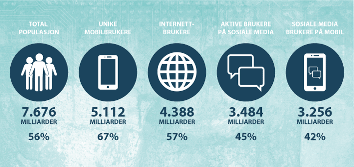 4,4 milliarder mennesker, tilsvarende 57 prosent av verdens befolkning, bruker internett. Tallet er raskt stigende.2 Siden januar 2018 har det økt med én million brukere per dag. Likevel er det fortsatt 3,3 milliarder mennesker som ikke er internettbrukere. De fleste av disse lever i Sørøst-Asia og Afrika sør for Sahara.