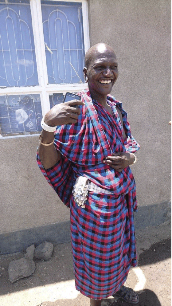 Figur 2.4 Leder av lokalsamfunnet, Mbaash, foran lokal helseklinikk som har fått internett tilgang via Basic Internet Foundation.