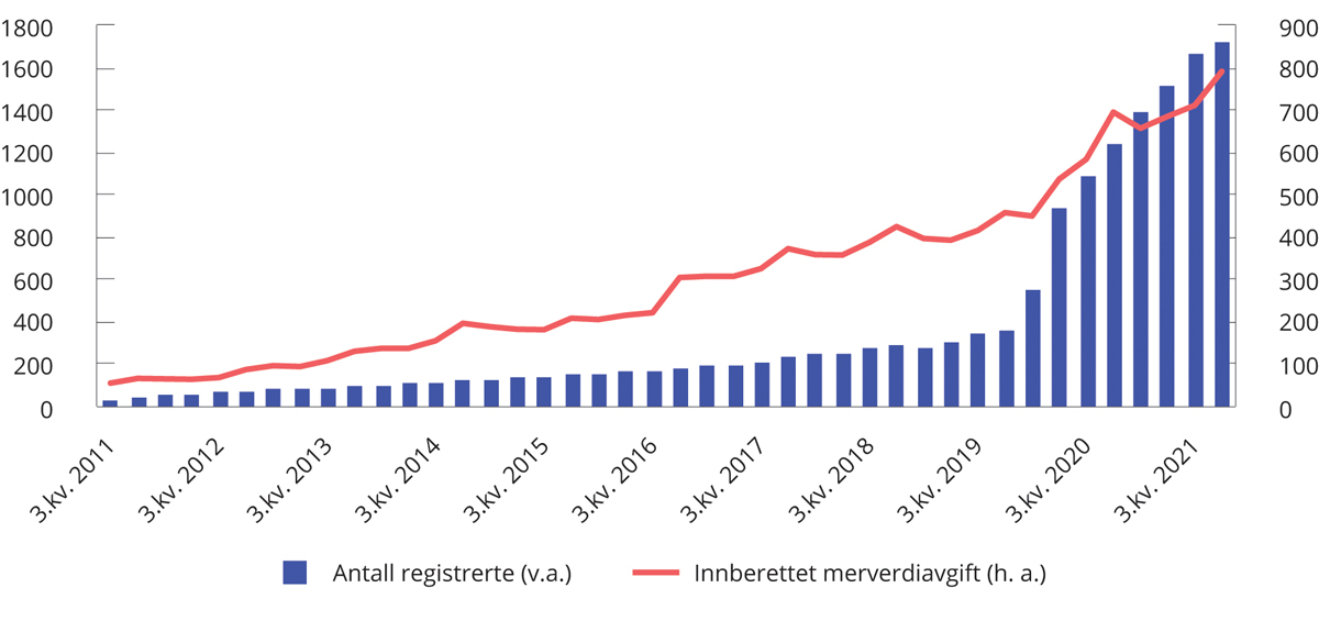 Figur 4.1 viser utviklingen i totalt antall registrerte tilbydere fra den forenklede ordningen for beregning og betaling av merverdiavgift for elektroniske tjenester (VOES) ble iverksatt i 2011. Antallet registrerte tilbydere økte betydelig etter at VOEC-ordningen ble innført i andre kvartal 2020. I perioden fra innføringen av VOEC-ordningen og ut 2021 økte antallet registrerte med i underkant av 1 200, slik at det totalt i VOEC-ordningen var registrert 1 728 tilbydere per 31. desember 2021. Figuren viser også innberettet merverdiavgift per kvartal. Ifølge tilbydernes innberetning utgjorde merverdiavgift bare for varer 178 mill. kroner i fjerde kvartal 2021, en økning på 40 mill. kroner fra samme kvartal året før. Disse tallene for varer inngår i de samlede innberettede beløpene i figuren. I tillegg betales det merverdiavgift som ledd i deklareringen når det innføres varer med verdi på 350–3 000 kroner der merverdiavgiften ikke er oppkrevd ved salgstransaksjonen og innbetalt via VOEC-ordningen, for eksempel der forsendelsen kommer fra en uregistrert tilbyder. For slik innførsel foreligger det ikke tilgjengelige provenytall.