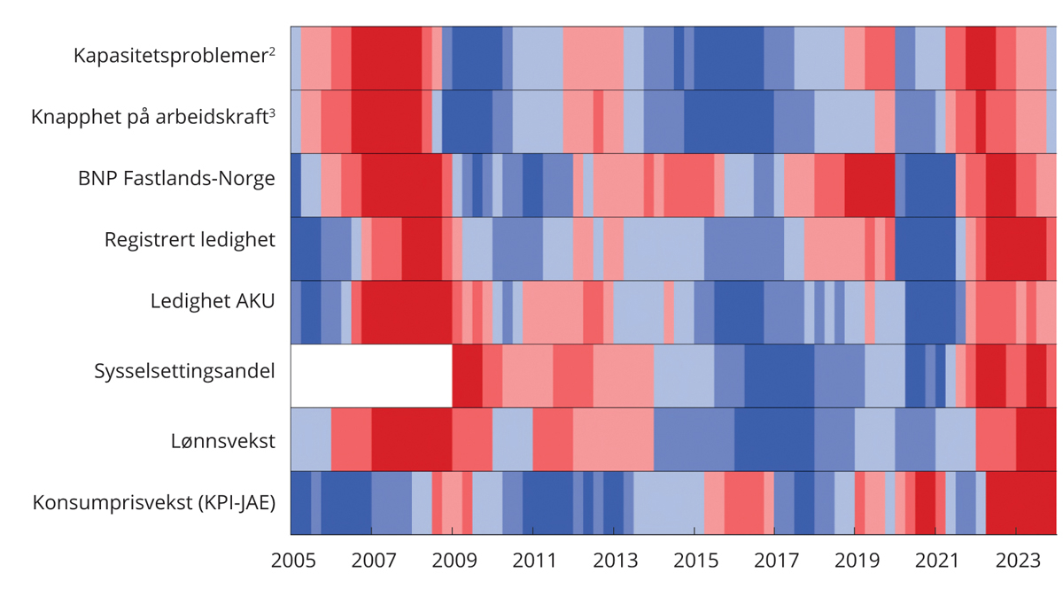 1 Røde farger er et tegn på høykonjunktur med press i økonomien, mens blå farger er et tegn på lavkonjunktur og ledig kapasitet. Fargeskalaen reflekterer hvor stort gapet er, eller hvor stort avviket fra gjennomsnittet for den aktuelle indikatoren er. De mørkeste fargene representerer den tredjedelen av observasjonene med størst positivt og negativt avvik. Indikatorene er målt som avviket fra gjennomsnittet i perioden 2005–2023, der observasjoner fra pandemiårene 2020 og 2021 er tatt ut. Unntaket er prisveksten, som er målt som avvik fra inflasjonsmålet og BNP som er målt som avviket fra en enkel trend, som innebærer at vi ikke har justert for den unormalt lave aktivitetsutviklingen gjennom pandemien. Trenden er estimert ved hjelp av Hodrick-Prescott-filter, der glattingsparameteren er satt til 6400, som tilsvarer 400 på årsbasis.