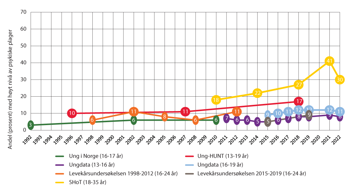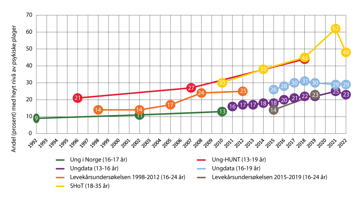 De fleste barn og unge rapporterer om god livskvalitet og tilfredshet med livet. Likevel viser en rekke undersøkelser en betydelig økning over tid i selvrapporterte psykiske plager blant både barn, unge, og unge voksne. Økningen har skjedd gradvis siden 1990-tallet og særlig blant jenter. Bare siden 2011 har økningen i selvrapporterte psykiske plager i Ungdata vært på omkring 30 prosent. For jenter har økningen vært på 44 prosent, mens for gutter har den vært på 14 prosent.