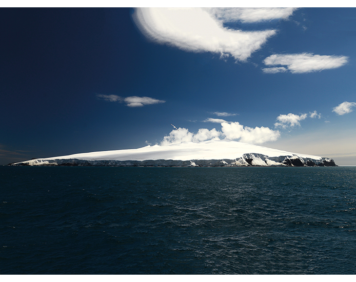 Figur 2.1 Bouvetøya regnes som den mest avsidesliggende øya i verden. Den er som oftest innhyllet i skyer eller tett tåke. Her er Bouvetøya fotografert på en sjelden klarværsdag.