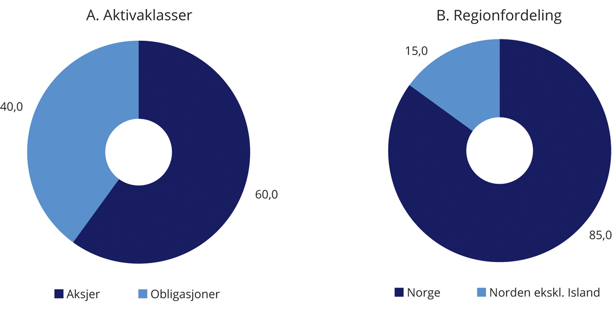 Finansdepartementet har i mandatet for SPN fastsatt en strategisk referanseindeks bestående av en aksjeindeks og en obligasjonsindeks, som utgjør hhv. 60 og 40 pst. Fordelingen mellom aksjer og obligasjoner gir uttrykk for eiers investeringspreferanser og risikotoleranse. Valg av aksjeandel er den beslutningen som i størst grad bestemmer SPNs risiko. Referanseindeksen er videre fordelt med 85 pst. i Norge og 15 pst. i Norden for øvrig utenom Island, se figur 4.1.