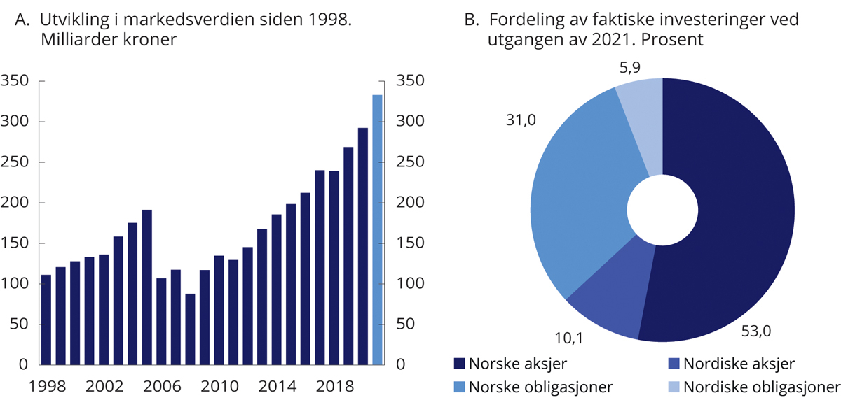 SPN hadde ved utgangen av 2021 en markedsverdi på 333 mrd. kroner, se figur 4.2A. Det tilsvarer en økning på om lag 41 mrd. kroner fra inngangen til året, etter fradrag for forvaltningskostnader. Fondets aksjeportefølje hadde en markedsverdi på om lag 210 mrd. kroner, hvorav aksjer i norske selskaper utgjorde 176 mrd. kroner og aksjer i øvrige nordiske land 34 mrd. kroner. Obligasjonsporteføljen hadde en verdi på om lag 123 mrd. kroner, fordelt med 103 mrd. kroner i obligasjoner fra utstedere i Norge og om lag 20 mrd. kroner i obligasjoner fra utstedere i andre nordiske land.2 Fordelingen av investeringene ved utgangen av 2021 er vist i figur 4.2B.