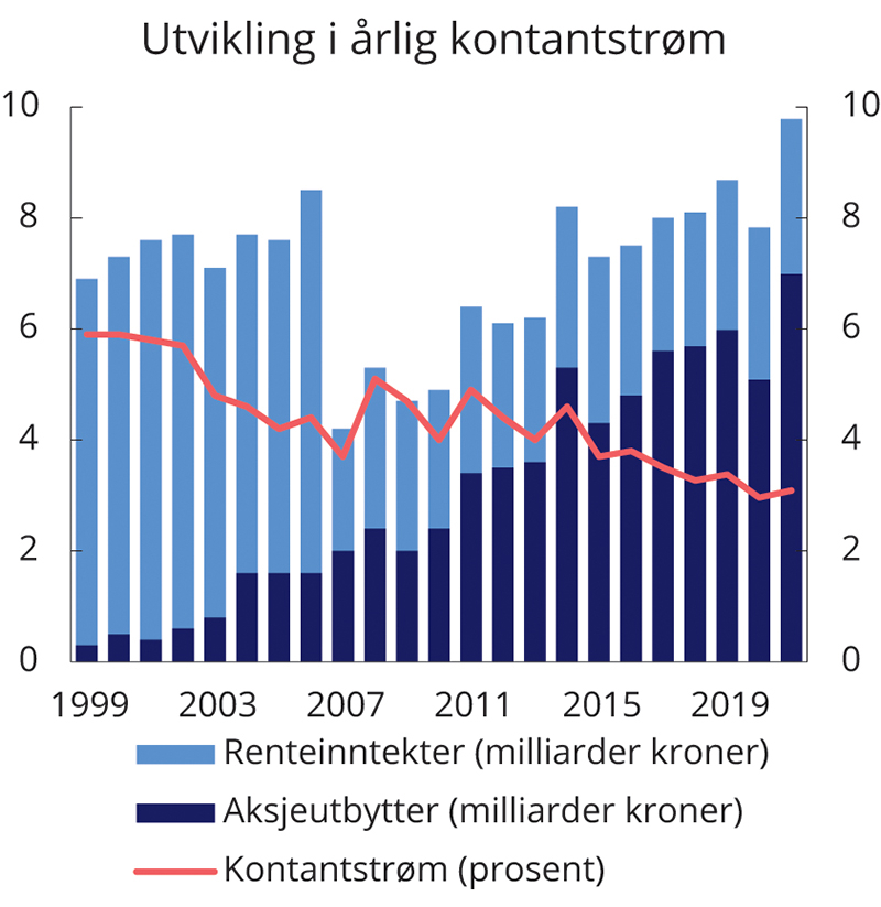 Obligasjonsinvesteringene gir løpende renteinntekter til fondet. Også aksjeinvesteringene gir løpende inntekter, i form av utbyttebetalinger til selskapenes aksjonærer. I 2021 var kontantstrømmen fra aksjeutbytter og renteinntekter 9,8 mrd. kroner, eller om lag 3,1 pst. målt som andel av gjennomsnittlig markedsverdi av SPN, se figur 4.4. Målt over de siste 20 årene har gjennomsnittlig årlig kontantstrøm i SPN tilsvart 4,1 pst. av fondets gjennomsnittlige markedsverdi.