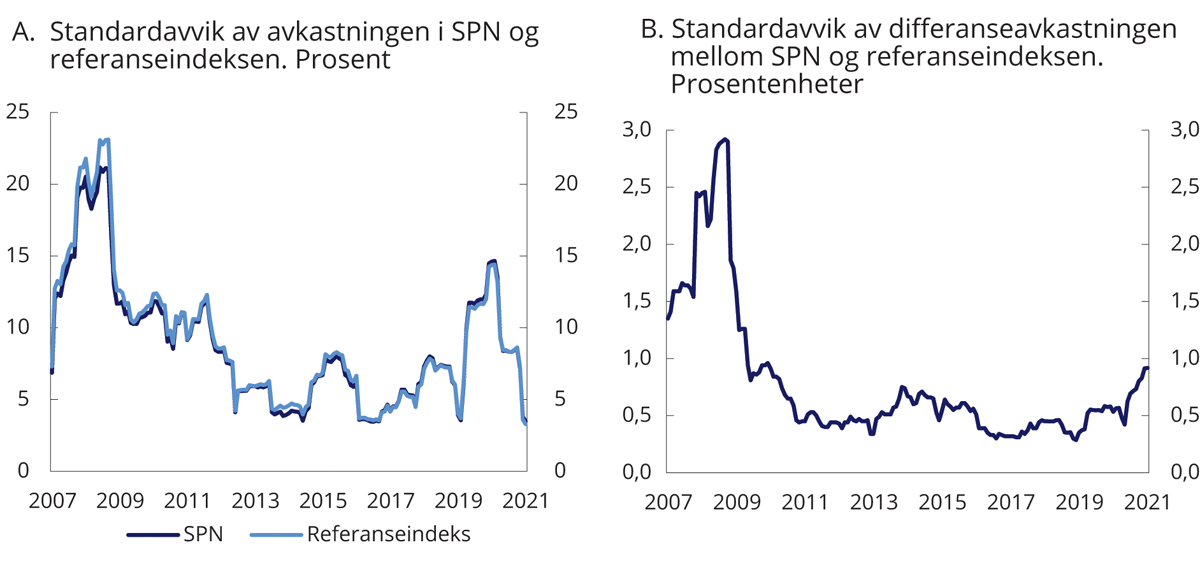 Realisert relativ volatilitet er et uttrykk for den historiske relative risikoen i SPN, målt ved svingninger i meravkastningen. Det siste året har svingningene i differanseavkastningen vært i størrelsesorden 0,4–0,9 prosentenheter, målt over rullerende tolvmånedersperioder, se figur 4.6B. Både forventet og realisert relativ volatilitet var ved utgangen av 2021 på et lavt nivå sammenlignet med gjennomsnittet siden januar 2007. Det samsvarer med analyser som tyder på at svingninger i avkastningen av referanseindeksen i stor og økende grad forklarer svingninger i avkastningen av SPN.