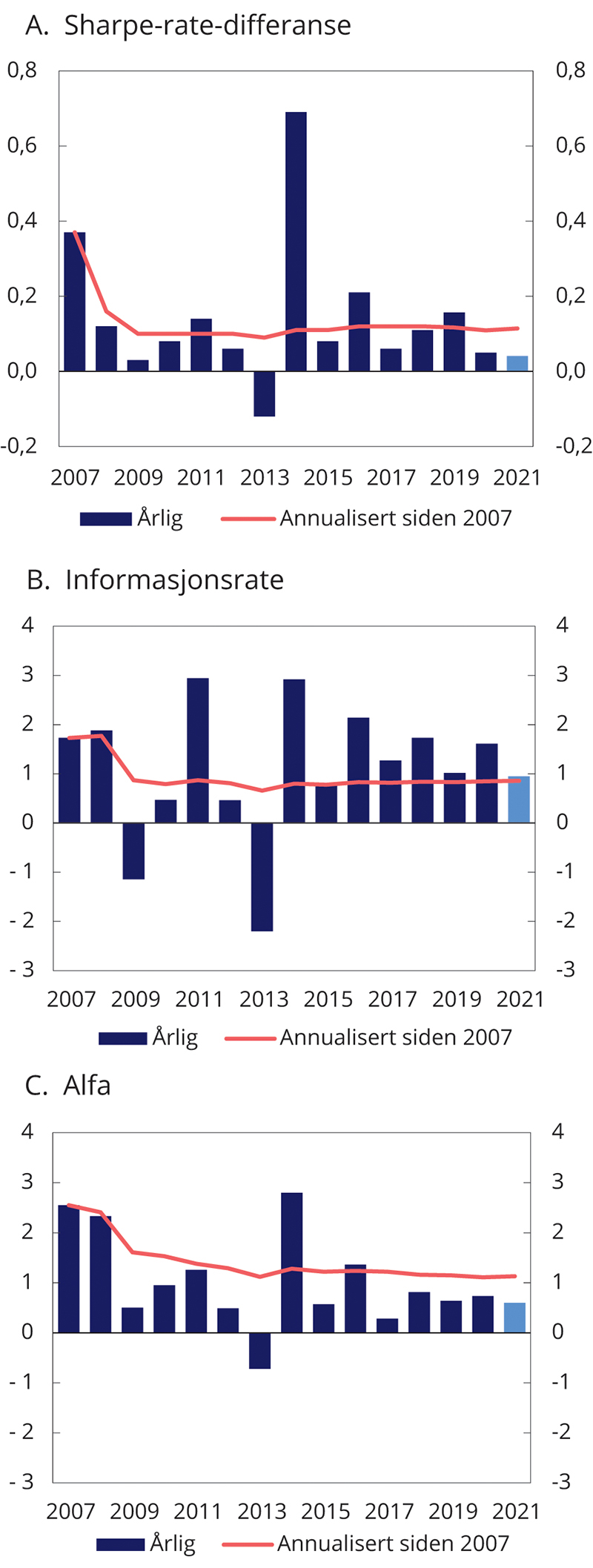 Alfa er et modellbasert mål på risikojustert meravkastning. I beregningen av alfa justeres Folketrygdfondets meravkastning for om forvaltningsresultatene er oppnådd ved å ta mer eller mindre systematisk risiko enn i referanseindeksen. I 2021 var porteføljens alfa 0,6 prosentenheter, se tabell 4.3 og figur 4.7C. Et anslag for alfa som er større enn null kan tyde på at meravkastningen er høyere enn det som følger av en ren kompensasjon for systematisk risikotaking. Siden januar 2007 har Folketrygdfondet oppnådd en gjennomsnittlig årlig alfa på 1,1 prosentenheter.