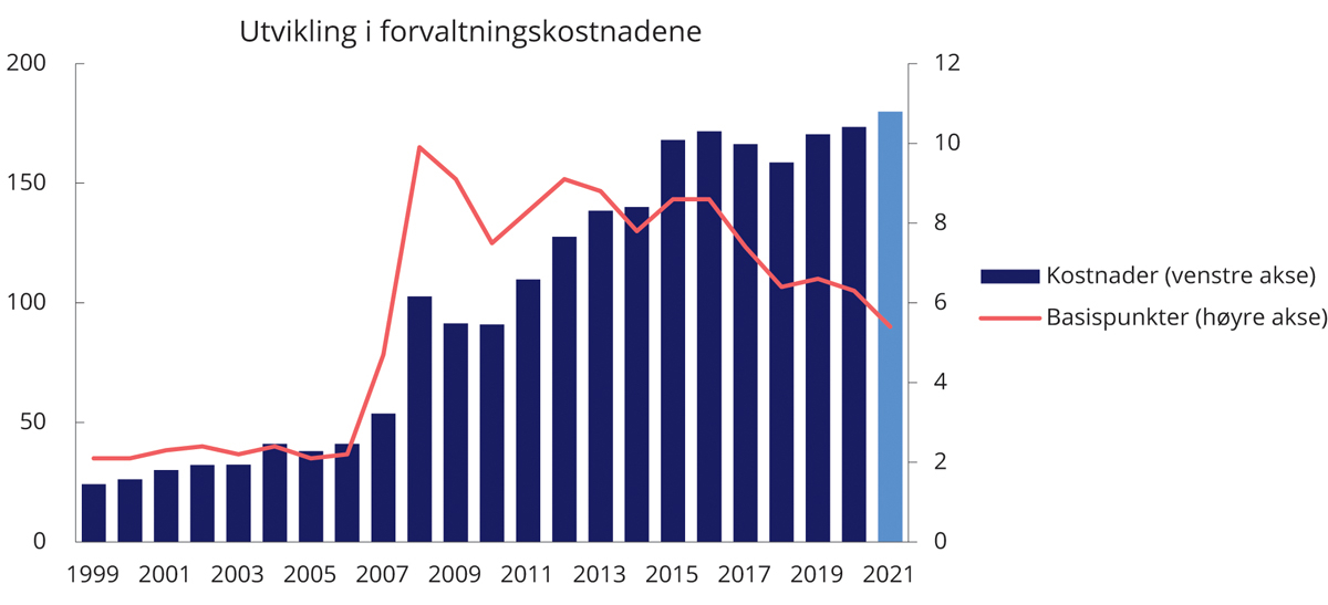Figur 4.8 Utvikling i forvaltningskostnader i SPN. Millioner kroner (venstre akse) og basispunkter (høyre akse). Ett basispunkt = 0,01 prosent