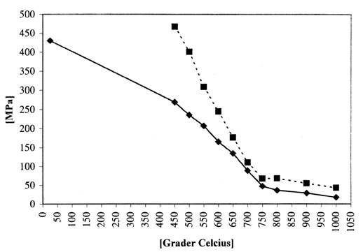 Figur 6.2 illustrerer at flytegrensen til stålet faller med økende temperatur. Merk at flytegrensen avtar raskest med økende temperatur i området fra 450 °C til 750 °C. Merk også at strekkfastheten nærmer seg flytegrensen i øvre del av det samme temperaturintervallet. Dette innebærer at materialets evne til å ta opp deformasjon, før et brudd oppstår, avtar.