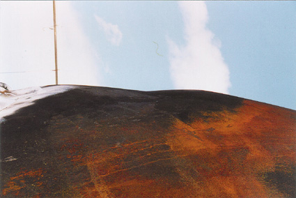 Figur 6.4 til figur 6.6 viser den enden av vogn 1 som har vært eksponert for flammene under brannen. Tre viktige elementer som kommer til syne i disse fotografiene er inntrykkningen rett over mannhullet, utbulingen på toppen av endeflaten og rustranden som omringer den øvre delen av endeflaten, se figur 6.4.
