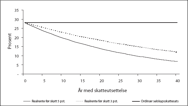 Muligheten til å utsette skatt på driftsoverskudd innebærer en lettelse i den effektive beskatningen (skattekreditt), og kan illustreres med et eksempel: Dersom utbetalingen av et utbytte på 1 mill. kroner utsettes med N år, kan den utsatte skatten på 280 000 kroner dekkes ved at eier «i dag» setter av [280 000/(1 + rente etter skatt)N ] kroner. Dette beløpet er mindre enn 280 000 kroner, og differansen uttrykker skattekredittens verdi. Verdien av skattekreditten er større desto større renten etter skatt er, og desto lenger utbetalingen av utbytte utsettes. Figur 7.1 illustrerer denne effekten. Det er lagt til grunn to situasjoner med hhv. 5 prosent og 3 prosent realrente før skatt som gir hhv. 3,6 prosent og 2,2 prosent realrente etter skatt. Figuren viser at den personlige investor kan redusere den effektive selskapsskattesatsen vesentlig ved å utsette innbetalingen av skatt på overskudd for et gitt år. Dersom investoren velger å utsette innbetaling av selskapsskatt fra år 0 med eksempelvis 20 år, kan han i en situasjon med 5 prosent realrente før skatt finansiere dette ved i år 0 å sette av et beløp som tilsvarer om lag 14 prosent av overskuddet. Dette vil etter 20 år ha forrentet seg til skattekravet fra overskuddet i år 0. Implisitt vil derfor i dette tilfellet en skatteutsettelse i 20 år innebære en selskapsskattesats på om lag 14 prosent i stedet for ordinær selskapsskattesats på 28 prosent. I dette tilfellet vil altså skattekredittens verdi være om lag halvparten av beløpet som under ordinær selskapsbeskatning forfalt til betaling i år 0, her om lag 140 000 kroner.