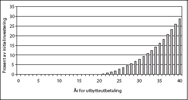 Figur 7.2 Meravkastning i prosent av initialinvestering ved investering i rederivirksomhet etter antall år før utbytteutbetaling