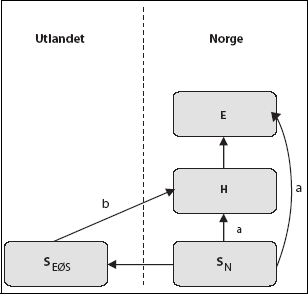 Figur 7.3 illustrerer problemstillingen. Eiere og selskaper tilknyttet sjøfart med lokalisering i Norge er organisert som vist i strukturen til høyre for å tilfredsstille vilkårene i den norske rederiskatteordningen. Inntekter i et norsk skipseiende selskap SN er da fritatt for løpende overskuddsskatt. For å unngå beskatning må disse inntektene reinvesteres innenfor rederiskatteordningen. Ved uttak fra det skipseiende selskap SN til enten H eller E (markert a i figuren), vil utbetalingen fra SN utløse skattlegging med ordinær selskapsskatt.