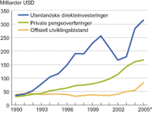 Figur 3.4 Ulike pengestrømmer til alle utviklingsland. 1990 – 2006. Milliarder USD
