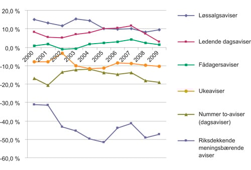 Ulike konkurranseforhold påvirker forutsetningene for fortjeneste. Figur 6.6 gir en oversikt over driftsmarginen til ulike avistyper i perioden 2000 til 2009.17 Som figuren illustrerer, er driftsmarginen relativt god for løssalgsavisene og de ledende dagsavisene, mens den er dårligst for riksspredte meningsbærende aviser, nummer to-aviser og ukeaviser.