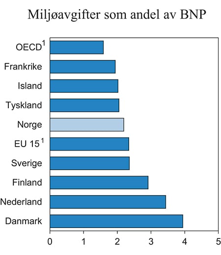 Det er komplisert å sammenligne nivået på miljøavgifter internasjonalt fordi det er betydelig variasjon i hva som anses som miljøavgifter i ulike land. For eksempel regnes energiavgifter i mange land som miljøavgifter. Figur 6.2 illustrerer inntektene fra miljørelaterte avgifter som andel av BNP i utvalgte land. BNP-tallene er ikke korrigert for petroleumssektoren.