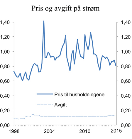 Figur 6.20 Pris (inkl. nettleie og avgifter) og avgift på elektrisk kraft for husholdninger 1. kvartal 1998–2. kvartal 2015. 2015-kroner per kWh