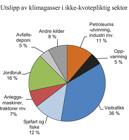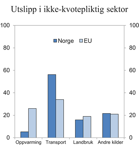 Kostnadene ved å redusere utslipp i ikke-kvotepliktig sektor i Norge vil trolig være høyere enn for gjennomsnittet av landene i EU. Ikke-kvotepliktig sektor omfatter i hovedsak transportsektoren (utenom kvotepliktig luftfart), landbruk, innenriks sjøfart og fiske, oppvarming av bygninger og avfallssektoren, jf. figur 6.3.