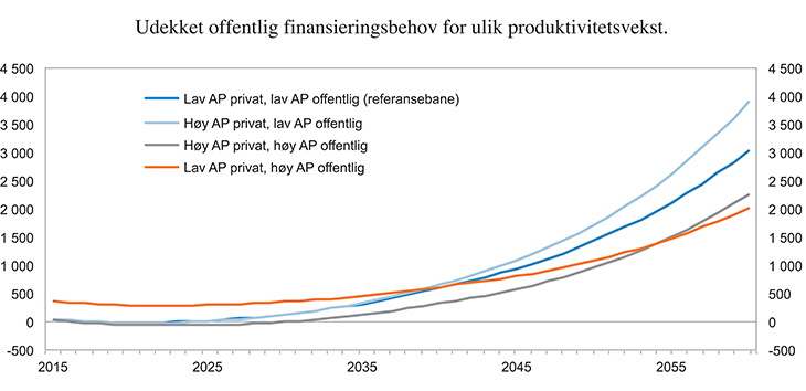 Også økningen i den løpende verdien av det udekkede finansieringsbehovet er et resultat av motstridende effekter. På den ene siden fører sterkere AP-vekst til høyere produksjon, inntekter, og dermed skattegrunnlag i Fastlands-Norge. I motsatt retning virker likevektseffekter som er bredt aksepterte når perspektivet er langsiktig. For det første innebærer konkurransen i privat sektor at produktivitetsveksten på lang sikt ikke tilfaller kapitaleierne i form av ekstra kapitalavkastning, men arbeidstakerne. Timelønnsveksten i konkurranseutsatte næringer øker fra 3 til 4 pst. når AP-veksten øker med 1 prosentpoeng. For det andre innebærer konkurransen om arbeidskraften at timelønnsveksten spres til alle sysselsatte, også offentlig ansatte, selv om arbeidskraften her ikke har blitt mer produktiv. For det tredje innebærer norske regler at lønnsveksten også spres til dem som forsørges av trygder i stedet for eget arbeid, fordi de fleste pensjoner og andre offentlige kontantstønader reguleres med lønnsveksten. Via disse lønnseffektene på de fleste offentlige utgifter, gir en isolert AP-vekst sterkere økning i offentlige utgifter enn i offentlige inntekter. Denne nettoeffekten avhenger imidlertid av de konkrete forutsetningene som bestemmer det direkte og indirekte lønnsinnholdet i skattegrunnlagene og offentlige utgifter. Figur 4.10 viser at effektene tilnærmet oppveier hverandre fram til rundt 2025. Deretter fører forsterket AP-vekst til at utgiftsveksten blir sterkere enn inntektsveksten. Resonnementet forutsetter at AP-veksten i markedsrettede næringer ikke øker produktiviteten i offentlig tjenesteproduksjon. Dette vil være en urimelig forutsetning i den grad AP-veksten skyldes generelle teknologisk framgang, f.eks. anvendelser av IKT.