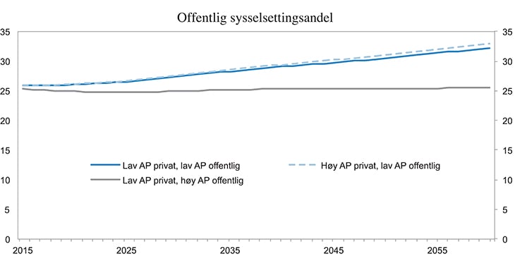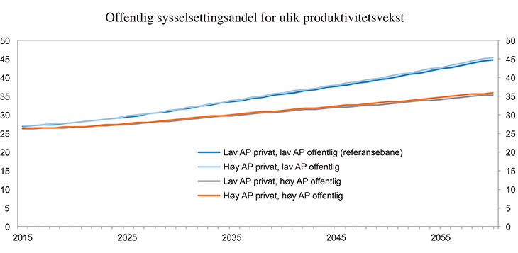 Punkt 3 fortjener en utdyping. Norge la i 2010 en 20-årig yngrebølge bak seg. Nå øker andelen av befolkningen som er eldre enn 66 år. Dette bidrar til at produksjonen av helsetjenester og eldreomsorg vil øke relativt markert fra rundt 2025, fordi befolkningsandelen som er 80 år og eldre da vil øke relativt sterkt. Det meste av denne produksjonen skattefinansieres, og stat og kommuner dominerer også som produsenter. Sammenlignet med markedsrettet produksjon vokser produktiviteten per forutsetning saktere i produksjonen av helse- og omsorgstjenester og andre tjenester som offentlig forvaltning har et hovedansvar for. Overføringen av ressurser fra privat sektor til helse- og omsorgssektoren bidrar derfor til å redusere den gjennomsnittlige produktivitetsveksten for hele økonomien. Overføringen skjer relativt raskt i referansebanen når standarden på alle sivile offentlige tjenester heves med 1 pst. per år. Offentlig sektors sysselsettingsandel øker da fra 27 pst. i 2014 til 45 pst. i 2060, se figur 4.4. Veksten i offentlig konsum er enda noe sterkere. Hovedgrunnen til dette er at helse- og omsorgssektoren øker sin andel av offentlig produksjon, og denne sektoren kjøper flere varer og tjenester fra privat sektor per produsert enhet enn resten av den sivile offentlige sektoren.
