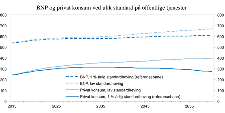 Det er større grunn til å tvile på at standardhevingen på offentlige tjenester vil fortsette med uforminsket styrke mens privat forbruk per innbygger faller markert. Man kan imidlertid ikke utelukke at befolkningen vil ønske å forsake en del av det som vil være forbruksvekst utover dagens nivå til fordel for bedre utdanning og helse- og omsorgstjenester. Referansebanen innebærer en betydelig omfordeling av ressurser fra yrkesaktive til yrkespassive, spesielt alderspensjonistene. Det skyldes både at pensjonistenes befolkningsandel øker, og standardhevingen, uten økte brukerbetalinger, på helse- og omsorgstjenestene som de eldre bruker mest av.