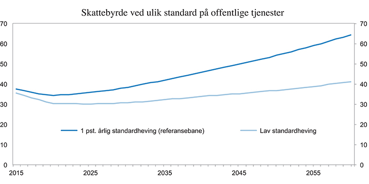 Figur 4.5 viser at fram til rundt 2020 er det rom for å senke denne husholdningsskattesatsen med 3 prosentpoeng fra det beregnede 2015-nivået på 37 pst. Deretter må skattesatsen økes i alle år. I 2060 passeres 64 pst. Selv om man godt før 2060 kommer opp i skattesatser som neppe vil bli vedtatt, har det interesse å utdype hvorfor den nødvendige skattebyrden vokser så raskt etter 2020. For det første øker forholdet mellom antall eldre og yrkesaktive. Betydningen av denne aldringen forsterkes etter 2025 på grunn av forsterket vekst i antallet som er 80 år og eldre, som er de tyngste brukerne av helse- og omsorgstjenester. For det andre bidrar standardhevingen til eksponensiell vekst i utgiftene til offentlig tjenesteyting som får sterk virkning når framskrivningene går fram til 2060. En tredje viktig effekt er at økningen i offentlig sysselsetting fortrenger privat sysselsetting, og dermed grunnlagene for merverdiavgiften og andre indirekte skatter, arbeidsgiveravgiften og andre skatter betalt av bedrifter på overskudd og faktorinnsats. For det fjerde faller statens petroleumsinntekter etter 2025. Det gir svakere vekst i oljefondets kapital, og dermed svakere vekst i beløpet bak de 3,5 prosentene som årlig kan brukes til å dekke offentlige utgifter. For det femte motsvares ikke veksten i timelønn (3 pst. per år) av produktivitetsvekst som reduserer bruken av innsatsfaktorer i offentlig produksjon. Dette fører til at enhetskostnadene for offentlige tjenester øker i forhold til andre priser, såkalt Baumols kostnadssyke. Lønnsveksten er tilnærmet 3 pst. per år som et resultat av 1 pst. AP-vekst i konkurranseutsatt sektor og 2 pst. internasjonal prisvekst.