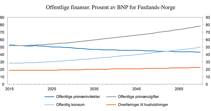 Figur 4.6 viser at offentlig forvaltnings primærinntekter (inntekter utenom rente- og andre formuesinntekter) faller i forhold til BNP for Fastlands-Norge gjennom hele framskrivningsperioden. Dette skyldes hovedsakelig at flyttingen av ressurser og produksjon fra privat til offentlig sektor reduserer skattegrunnlagene for indirekte og bedriftsbetalte skatter. Utgiftenes andel av BNP for Fastlands-Norge var vel 50 pst. i 2014, men passerer i denne framskrivningen hele 77 pst. i 2060. Her er det først og fremst utgiftene til offentlig konsum som vokser langt raskere enn Fastlands-Norges BNP.