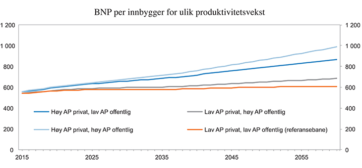 I hvilken grad vil høyere produktivitetsvekst forbedre den langsiktige veksten og velferdsstatens økonomiske fundament? Dette belyses ved å variere veksten i arbeidsproduktiviteten (AP) i markedsrettede og/eller offentlige tjenesteyting i forhold til referansebanen, mens alle andre forutsetninger beholdes. I referansebanen er den årlige AP-veksten «generelt lav» i alle år, henholdsvis 1 pst. i alle private næringer og 0 arbeidsbesparende AP-vekst for gitt produksjon i offentlig tjenesteyting. 2 pst. i alle år omtales i det følgende som «høy» AP-vekst i alle markedsrettede næringer. Arbeidsbesparende AP-vekst på 0,5 pst. i alle år omtales som «høy» AP-vekst i offentlig sektor, da denne kommer i tillegg til den produksjonsøkende TFP-veksten som ligger inne i referansebanen.