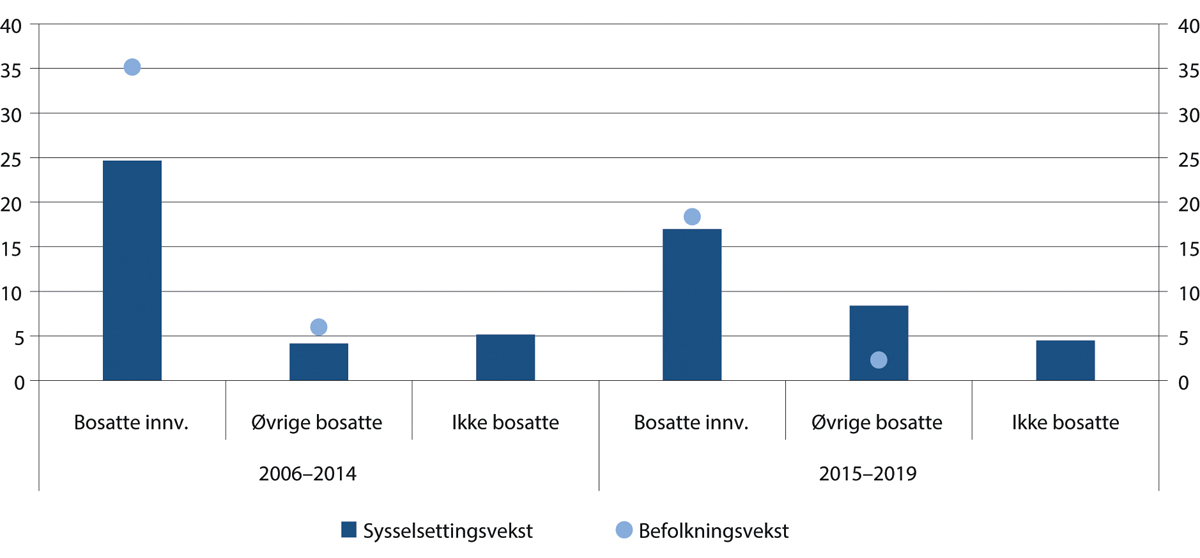 For bosatte uten innvandrerbakgrunn har sysselsettingsveksten vært høyere etter 2015 enn den var i årene før. Samtidig har befolkningsveksten avtatt. Det har ført til at andelen sysselsatte i denne gruppen økte fra 77,5 prosent i 2015 til 78,6 prosent i 2019 for aldersgruppen 20–66 år. For bosatte innvandrere har antallet sysselsatte og antallet i befolkningen økt omtrent like mye etter 2015. Det har bidratt til at sysselsettingsandelen har økt med over tre prosentpoeng for innvandrere, se også avsnitt 4.3.