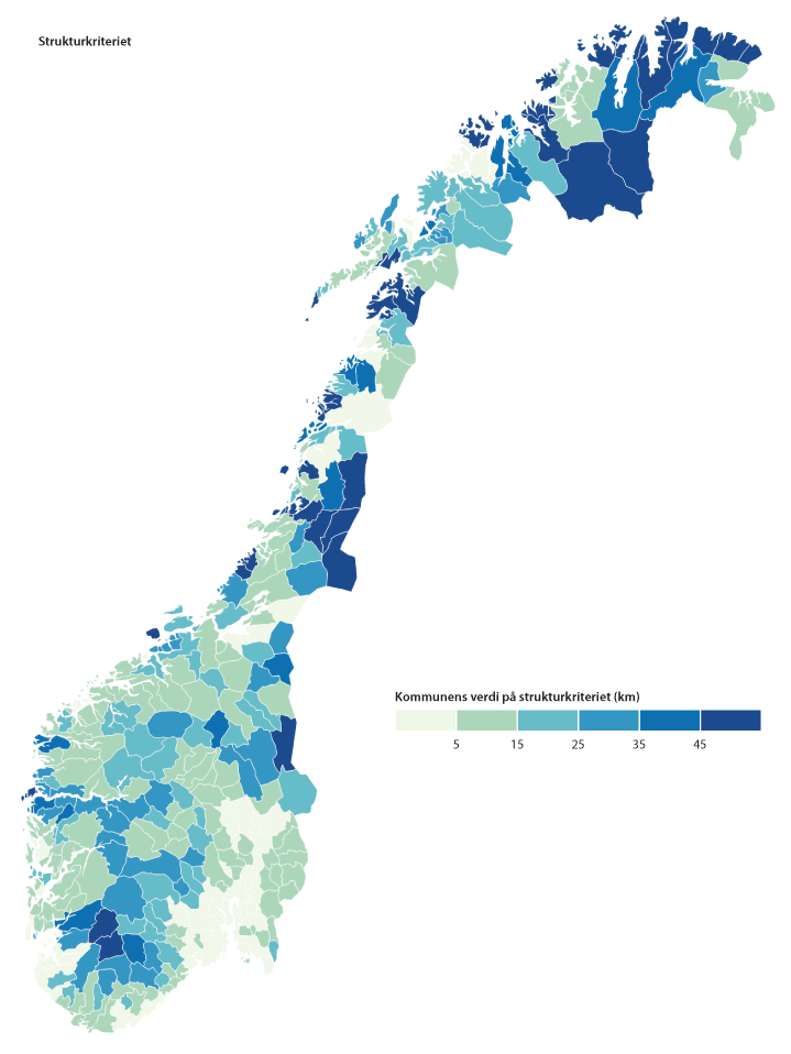 Strukturkriteriet beskriver gjennomsnittlig reiseavstand per innbygger i en kommune for å nå 5 000 innbyggere, uavhengig av kommunegrensen. Bakgrunnen for denne grensen er forskning som viser at det i hovedsak er kommuner med færre enn 5 000 innbyggere som har smådriftsulemper knyttet til lavt innbyggertall. Ekspertutvalget for kommunereform viste blant annet til at administrasjonskostnadene per innbygger synker kraftig med økende kommunestørrelse opp til om lag 5 000 innbyggere19, mens Langørgen m.fl. (2005) fant at stordriftsfordeler innenfor administrasjon, helse og grunnskole i stor grad er uttømt ved 5 000 innbyggere.20