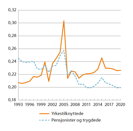 Figur 10.2 viser utviklingen i Gini-koeffisienten i perioden 1993–2020 for yrkestilknyttede og pensjonister/trygdede for inntekt etter skatt. Figuren viser at fordelingen av inntekt både for yrkestilknyttede og pensjonister/trygdede er sterkt preget av store svingninger i perioden rundt 2000, 2006 og 2015. Dette skyldes i hovedsak tilpasninger til den midlertidige utbytteskatten i 2001, innføringen av utbytteskatt på avkastning utover normalavkastning i 2006 (skjermingsmetoden for aksjonærer) og at skattesatsen på skattepliktige aksjeinntekter for personer (utbytte og realiserte aksjegevinster) økte fra 27 til 31,68 prosent fra 2015 til 2019. Gini-koeffisientene for både yrkestilknyttede og pensjonister/trygdede var om lag uendret mellom 2019 og 2020. Over tid er det en tendens til at fordelingen blant yrkestilknyttede har blitt noe skjevere, mens fordelingen blant pensjonister/trygdede har blitt jevnere.