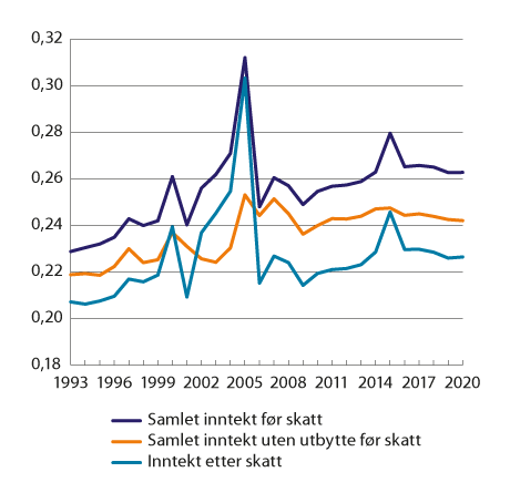 Figur 10.3 viser utviklingen i samlet inntekt før skatt med og uten utbytte og inntekt etter skatt over en lengre tidshorisont, 1993–2020. Figuren viser en betydelig variasjon i Gini-koeffisienten for inntekt før og etter skatt i årene rundt den midlertidige utbytteskatten i 2001, innføringen av ny utbytteskatt fra 2006 og økt skattesats på utbytte fra 2016. Særlig i årene før 2006 steg Gini-koeffisienten kraftig, mens den falt kraftig fra 2006. Disse endringene henger i stor grad sammen med tilpasninger knyttet til endringer i skattereglene som synliggjør inntekter i skattestatistikken. Særlig i forkant av innføringen av skatt på aksjeinntekter for personer (utbytte og realiserte gevinster) fra 2006 var det gunstig å ta ut kapital fra bedriftene som utbytte og tilbakeføre dette som innskutt kapital. Innskutt kapital kan senere tas ut uten å bli skattlagt på personens hånd. Slike transaksjoner vil i liten grad gi endringer i den reelle fordelingen, men har stor betydning for den målte fordelingen. Fordelingen av samlet inntekt uten utbytte før skatt viser betydelig mindre svingninger rundt de nevnte årene. Figuren indikerer at Gini-koeffisienten ikke gir et godt bilde på fordelingen for årene 2000–2006 og 2015.