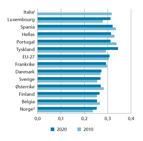 Inntektsulikheten, slik Eurostat måler den, er noe lavere i Norge enn i Danmark og Sverige og betydelig lavere enn i EU-27. Gini-koeffisienten for Norge var på 0,253 i 2020, mot 0,236 i 2010.