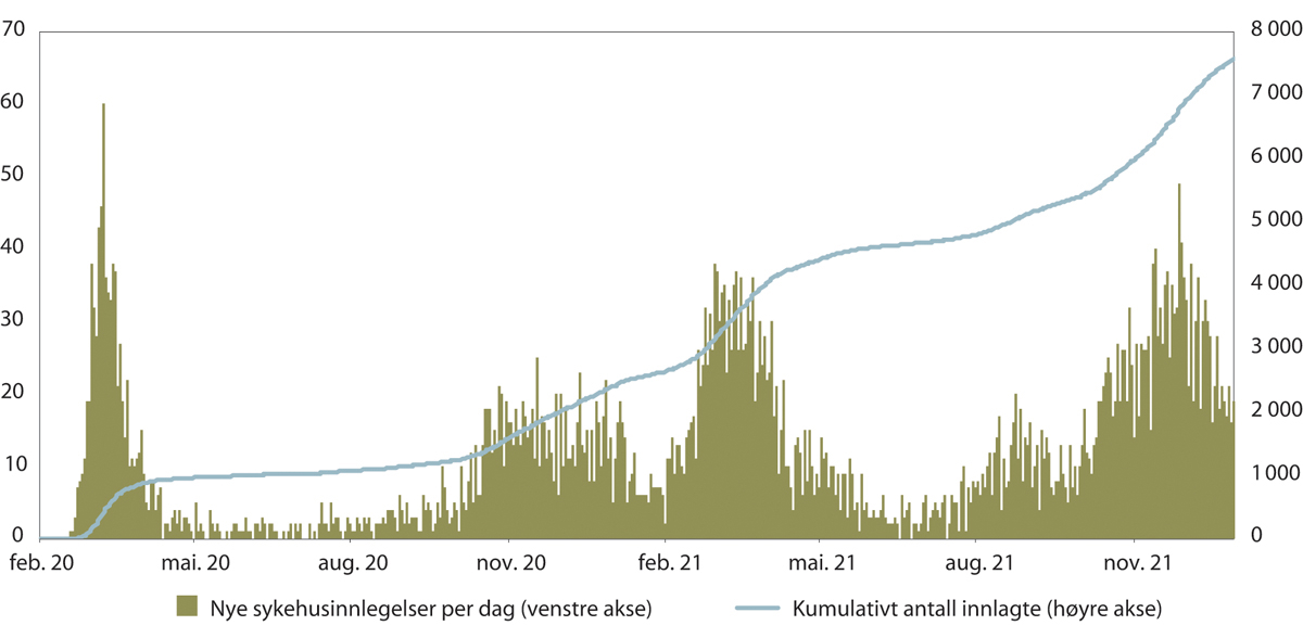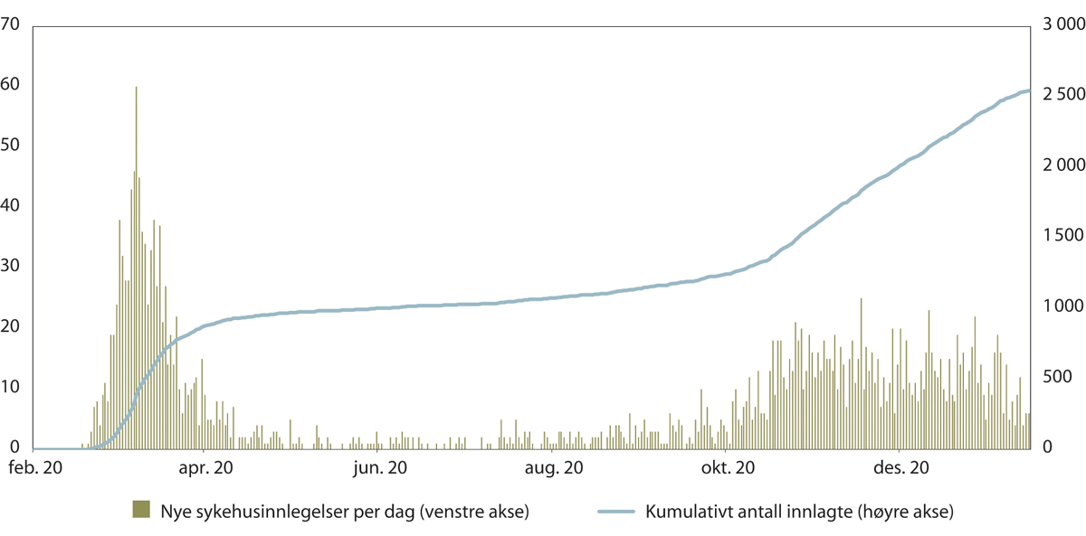 Mot slutten av oktober 2020 steg smitten markant. Mens det i august var 300 smittede per uke, var det i september 700 per uke og i oktober 900 per uke. R-tallet6 gjennom oktober var på 1,3. Den siste uken i oktober ble det registrert 3000 nye smittede. Alle aldersgrupper var rammet, og det var smitteutbrudd i alle fylkene i landet. Antall innlagte på sykehus var på dette tidspunkt ikke spesielt høyt, men det gikk oppover. Regjeringen beskrev situasjonen som den mest alvorlige siden mars 2020 og uttrykte bekymring for den videre utviklingen og kapasiteten i helsevesenet. På bakgrunn av denne bekymringen henvendte Helse- og omsorgsdepartementet (HOD) seg til de regionale helseforetakene og ba om å få status for intensivkapasiteten.7 Helseforetakene meldte tilbake at det av ulike grunner var krevende å oppnå maksimal senge- og intensivkapasitet.8 Det var god grunn til bekymring. I løpet av andre smittebølge måtte en rekke sykehus i perioder stoppe med planlagte operasjoner og behandlinger, og utsette behandling av pasienter uten covid-19. Figur 2.4 Første og andre smittebølge. Kilde: FHI