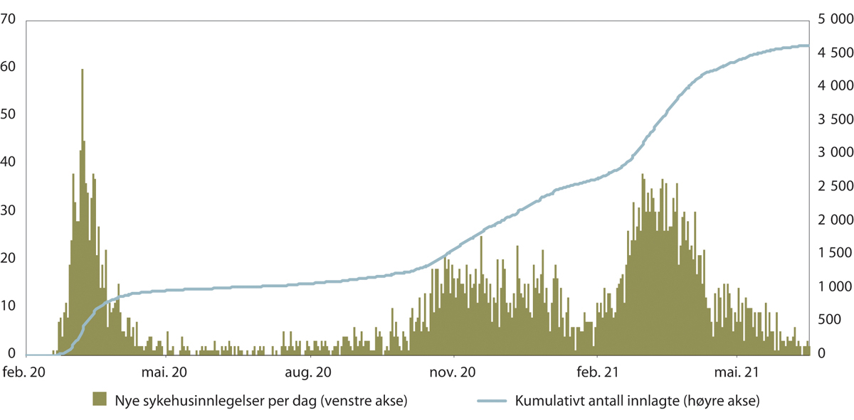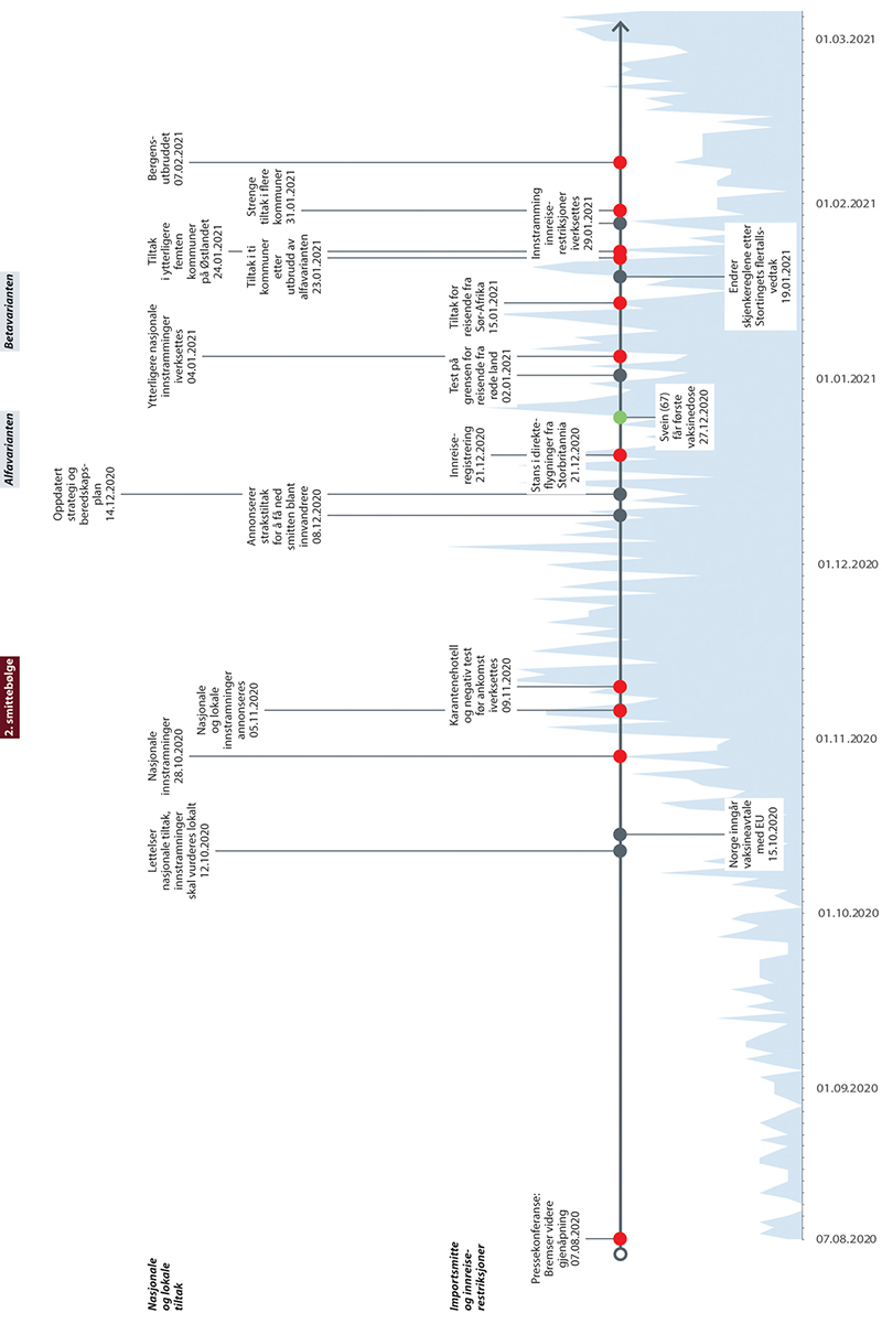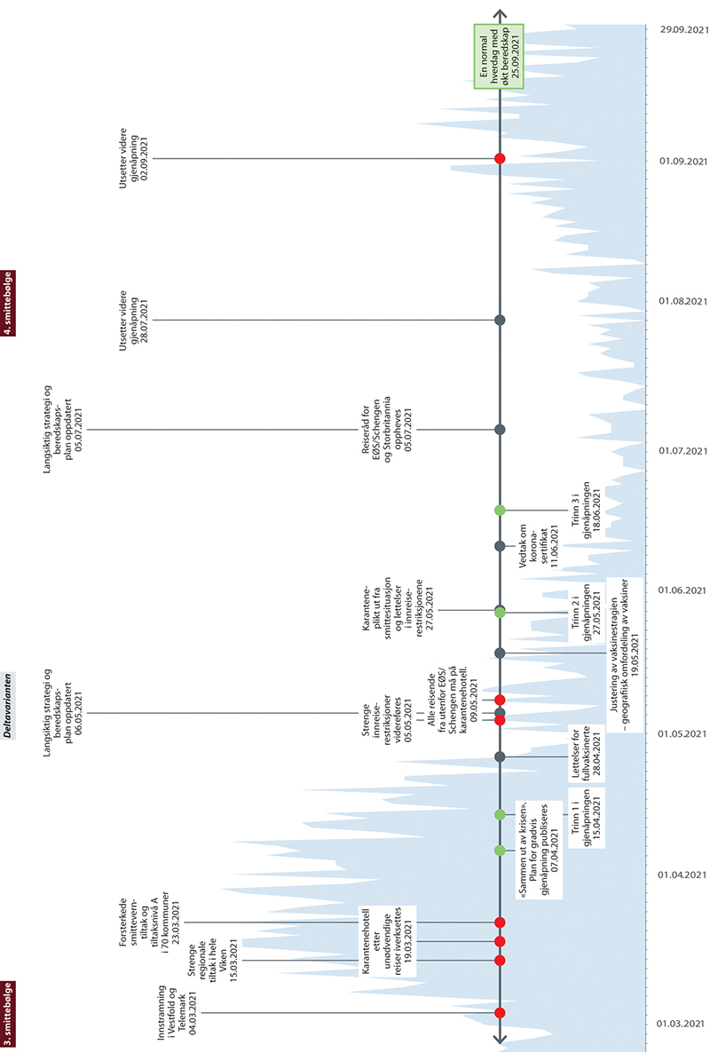 I den første rapporten vår beskrev vi hvordan samfunnet gradvis ble gjenåpnet etter at regjeringen i mars 2020 hadde innført omfattende tiltak for å bekjempe koronaviruset. Den 7. april 2020 konstaterte Folkehelseinstituttet (FHI) at utbruddet var slått ned.3 Dermed bestemte regjeringen at det skulle startes på en gradvis og kontrollert gjenåpning. I løpet av våren og sommeren åpnet samfunnet gradvis opp igjen. Barnehager og skoler ble åpnet for fysisk tilstedeværelse, og universiteter og høyskoler skulle komme i gang etter sommeren. Det samme skulle flere næringer som hadde blitt rammet av smitteverntiltakene. Den 1. august ble idretten startet opp for barn. Etter hvert ble det også åpnet for voksne. Det ble gjort gradvise lettelser i innreiserestriksjonene, og grensene ble igjen åpnet for arbeidsreisende og deretter fritidsreiser i Norden og EØS–Schengen-området.4