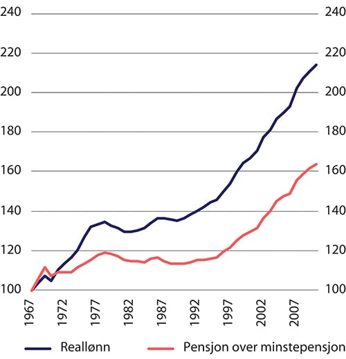 Den samlede effekten av reguleringen av pensjoner i de 43 årene fra 1967 til 2010 er illustrert i figur 10.6. Mens reallønningene økte med 114 prosent i perioden, hadde pensjonen over minstepensjon en reell økning på 64 prosent.