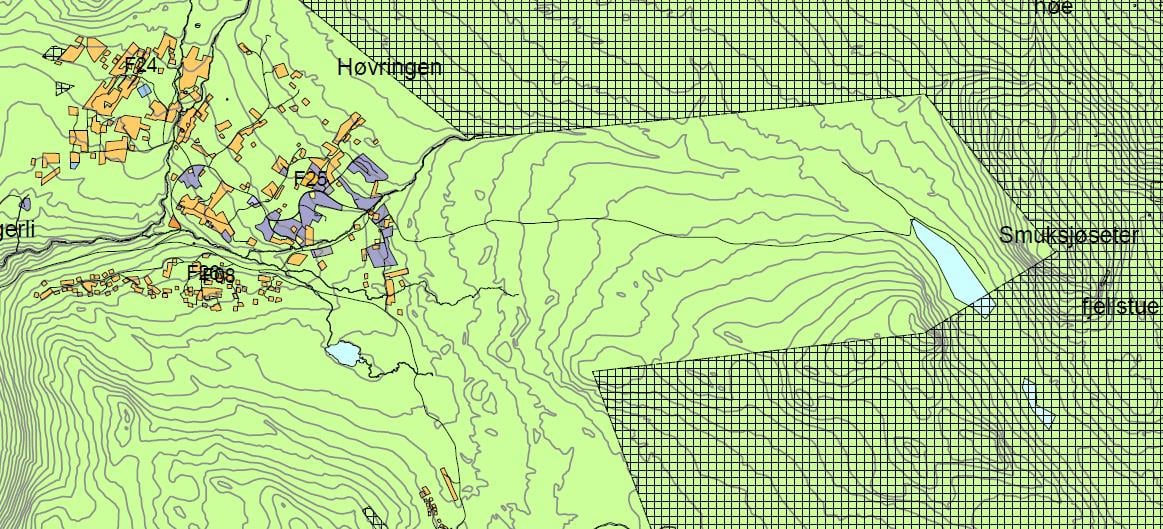 Merk at rundt Høvringsvatne til venstre er noen eiendommer i aktiv bruk til formål utover landbruksbegrepet, slik som Smuksjøseter fjellstue, og 2-3 fritidsboliger, buer og naust nær denne, ikke vist med eget formål i plankartet. De er kun navngitt som sted innenfor LNF-området etter pbl § 11-7 nr.5 bokstav a). Dette er et aktivt valg, som framhever at hensynet til LNF-formålene og Rondane nasjonalpark (angitt som hensynssone) skal ha hovedfokus i dette området, og at alle andre tiltak behandles som dispensasjonssaker. Det er i kommuneplanen gitt retningslinjer for dispensasjonsbehandling innenfor LNF-områdene.