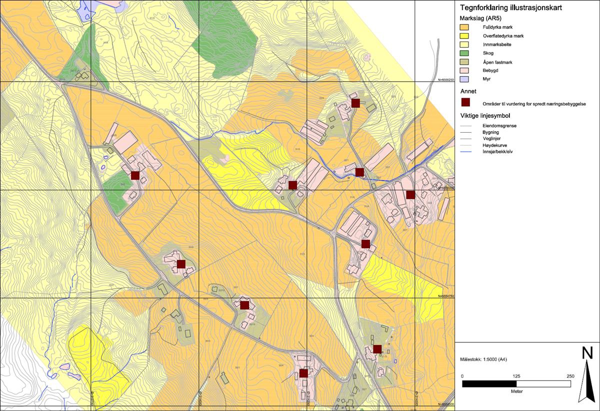 I begge eksemplene under benyttes illustrasjonskart med markslag (FKB-AR5) som bakgrunnskart (figur 2.1 og 2.2), noe som kan være til hjelp i vurderingen. Kartene er i målestokk 1:5000 som gir flere detaljer (bygg, koter, mv.) enn det som normalt vises på kommuneplankartet.