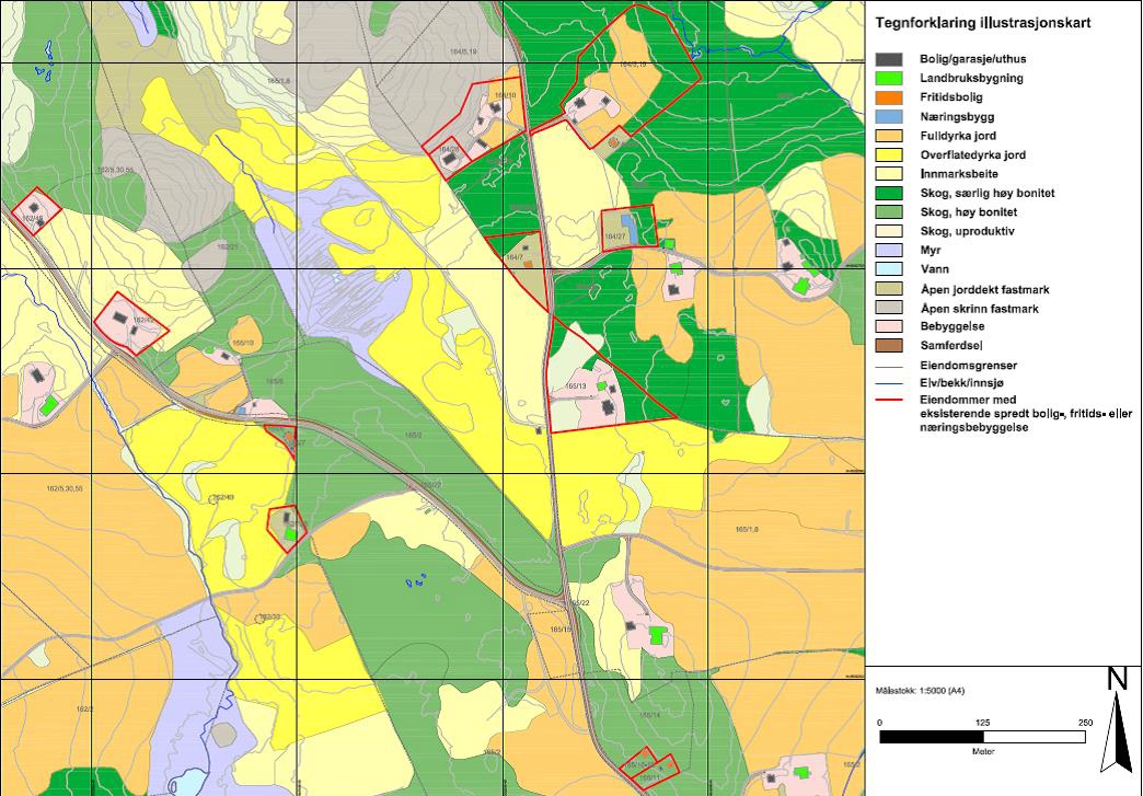 I de tilfeller der kommunen finner at en annen kartframstilling enn den som følger av «Nasjonal produktspesifikasjon for arealplan og digitalt planregister -Del 2», er mer egnet for å gi en tydelig framstilling av LNFR spredt bebyggelse, kan kommunen velge å supplere det ordinære plankartet med illustrasjoner/illustrasjonskart. Disse kan gjøres juridisk bindende, så lenge de ikke går utover det som etter pbl §§ 11-8, 11-9 og 11-1134 kan fastsettes gjennom bestemmelser til kommuneplanens arealdel.