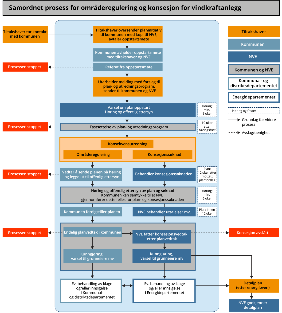 I denne veilederen viser vi hvordan prosessene for områderegulering for vindkraftanlegg etter plan- og bygningsloven og konsesjonsbehandling av vindkraftanlegg etter energiloven kan samordnes i tid med felles konsekvensutredning. Hensikten er å legge opp til en mest mulig effektiv og besparende prosess, med vekt på tidlig involvering av kommunen og berørte interesser.