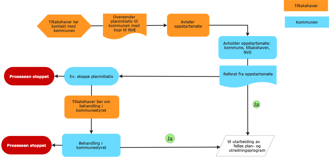 Tiltakshaver skal sende planinitiativet til kommunen med kopi til NVE samtidig med forespørsel om oppstartmøte med kommunen etter plan- og bygningsloven § 12-8. NVE bør også delta på oppstartmøtet, så langt NVEs ressurssituasjon gir anledning til det. Kommunen og NVE kan på møtet gi råd om hvordan planarbeidet og konsesjonsbehandlingen skal samordnes, og hvordan prosessene bør legges opp. Kommunen kan vedta at planinitiativet ikke skal føre fram og stoppe planinitiativet. Dette skal i så fall skje like etter at oppstartmøtet er avholdt, dersom ikke annet er avtalt. Beslutningen kan ikke påklages, men tiltakshaver kan kreve å få den forelagt for kommunestyret til endelig avgjørelse. Kommunen skal foreta en reell vurdering av planinitiativet og virkningene av det før de tar stilling til om de ønsker å la planinitiativet føre fram, eller om de ønsker å stoppe det.