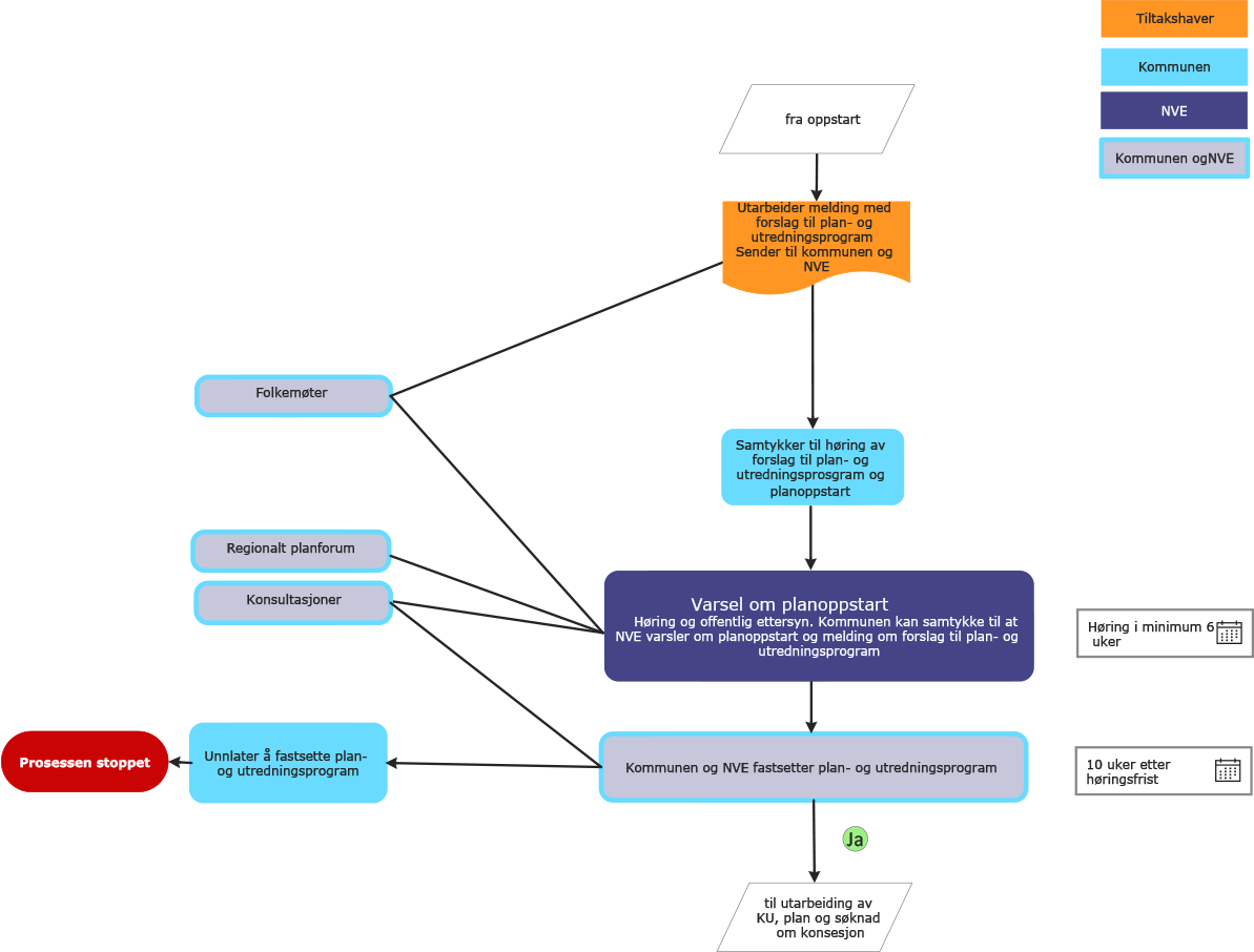 Formelt sett skal kommunen fastsette planprogram for områdereguleringen, mens NVE skal fastsette konsekvensutredningsprogram for konsesjonssøknaden. Disse slås sammen til et felles plan- og utredningsprogram. Kommunen bør fastsette planprogrammet knyttet til områdereguleringen før NVE fastsetter utredningsprogram knyttet til konsesjonen. Det må framgå i felles plan- og utredningsprogram hva som er knyttet til områdereguleringen og hva som er knyttet til konsesjonen, ev. hvilke deler som er felles.