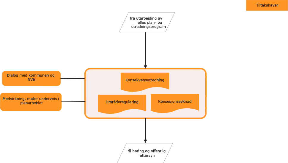 Prosess for utarbeidelse av planforslag og konsesjonssøknad med samordnet konsekvensutredning skal bygge på føringene gitt i plan- og utredningsprogrammet, og vil ellers være de samme som om prosessene ble gjennomført hver for seg. Tiltakshaver vil ha hovedansvaret for at plan- og bygningslovens og energilovens krav til innhold og medvirkning følges. Det betyr at tiltakshaver skal følge opp opplegget for samordnet plan- og konsesjonsprosess som ble fastsatt i plan- og utredningsprogrammet. Det er viktig med løpende dialog mellom tiltakshaver, kommunen og NVE. Dette kan bidra til å forbedre prosjektet og sikre framdrift og avklaring av uenigheter undervegs. Det bør også vurderes avholdt møte i regionalt planforum for å avklare regionale interesser og eventuelle uenigheter. Det bør på samme måten være dialog med representanter for berørte samiske interesser under utviklingen av planforslag og konsesjonssøknad.